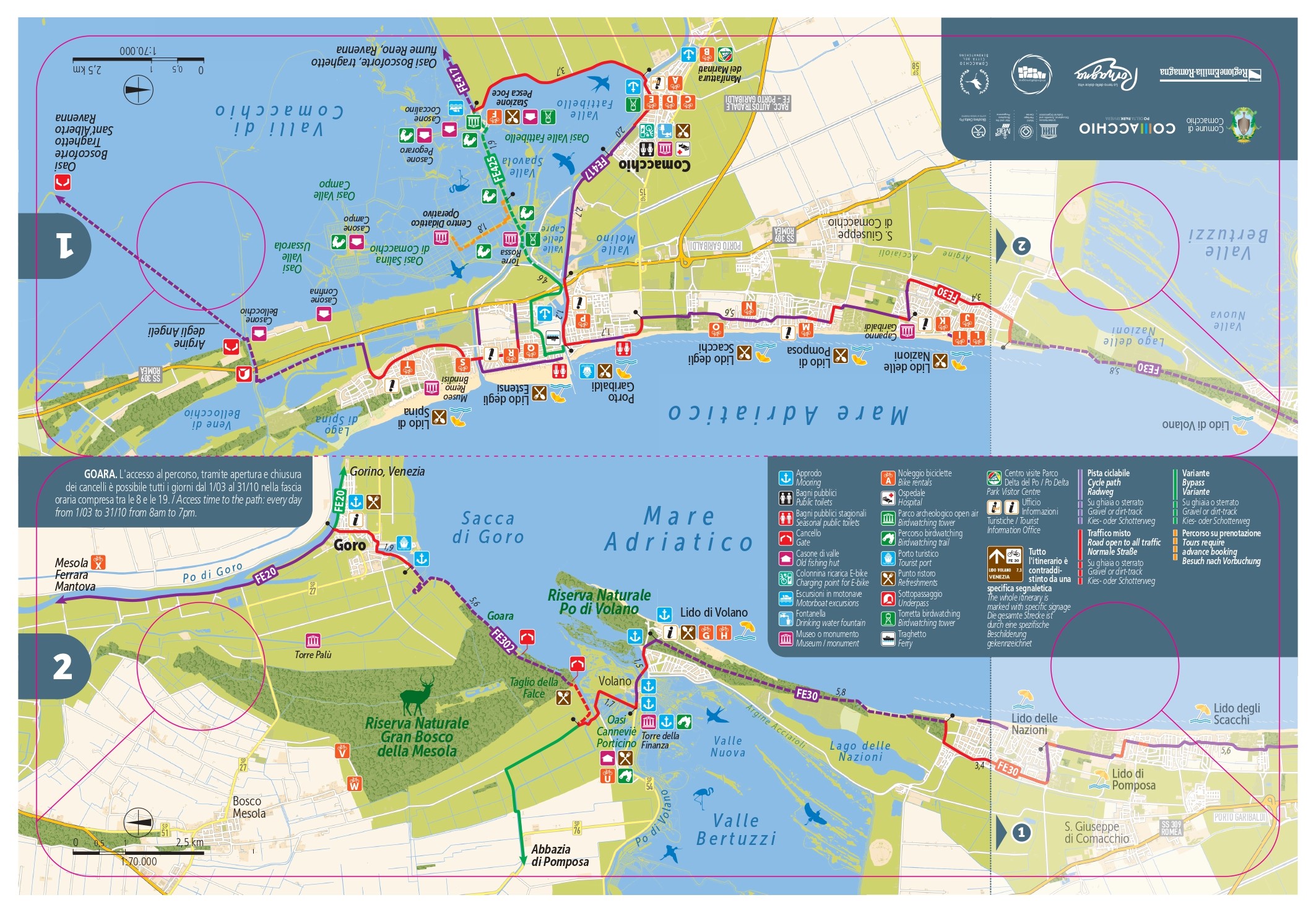 L'itinerario ricchissimo di tappe tra spiagge, arte, boschi, natura nei luoghi più suggestivi del Parco del Delta del Po. Da sud a nord si toccano le Valli di Comacchio, le famose lagune dove vivono le anguille e migliaia di specie di uccelli, tra cui i bellissimi fenicotteri rosa. Nell'entroterra si ammira il centro storico di Comacchio, solcato da canali, con l'imponente Trepponti e i suoi musei. Sulla costa grazie alle nuove ciclabili si attraversano i Lidi di Comacchio, le sette località balneari ideali per vacanze estive. Oltrepassato il Lido si Volano con la sua folta pineta e la Riserva Naturale del Po, si raggiungono la piccola Oasi di Canneviè-Porticino e la località Taglio della Falce dove si imbocca il corridoio ciclopedonale nel Gran Bosco della Mesola, per una piacevole pedalata all'ombra dei lecci e lungo le dune costiere della Sacca di Goro.