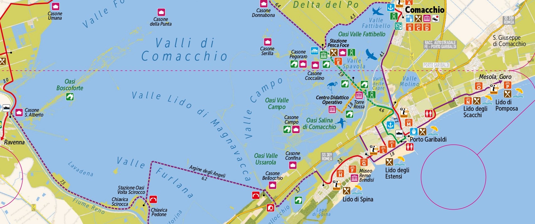 Un percorso ciclopedonale di oltre cinque chilometri nell’area sud delle Valli di Comacchio, realizzato fra la stazione di pesca Bellocchio e Volta Scirocco.
