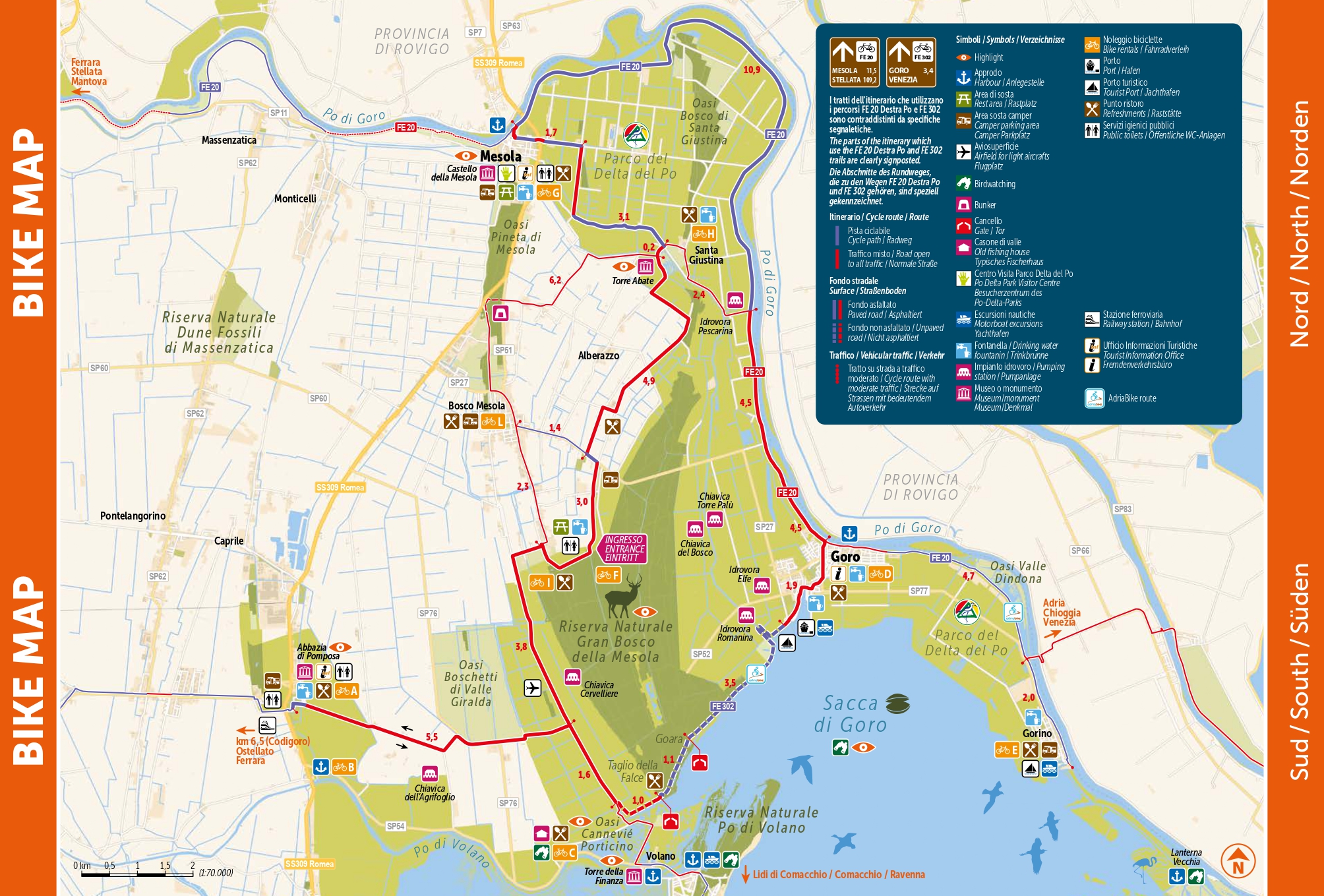 Caratteristiche tecniche: itinerario di media lunghezza in parte segnalato FE30, FE302, FE20. Fondo principalmente asfaltato con alcuni tratti sterrati ed uno sabbioso di circa 1 km nel Bosco della Mesola. Percorso adatto anche per la mountain bike. Questo itinerario è descritto nella Bike Map "Attorno al Bosco della Mesola" che comprende varianti e percorsi per scoprire la stazione nord del Parco del Delta del Po (scala 1:70.000)