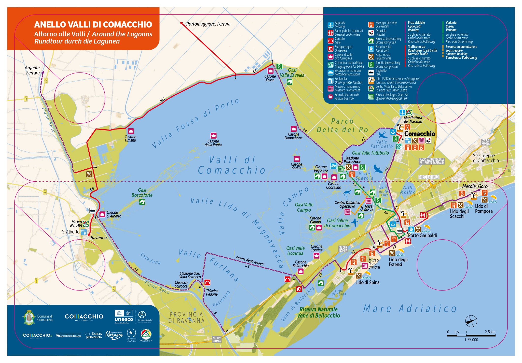 Il percorso, lungo 56 km, offre uno sguardo unico sulle Valli e i suoi tesori. Superato il Ponte San Pietro, percorrendo strade d'argine si fiancheggeranno la Stazione di Pesca Foce, il Casone Donnabona e Oasi Valle Zavelea, si proseguirà poi lungo l'argine Agosta sino a giungere alla Penisola di Boscoforte, lingua di terra che ospita i cavalli bianchi Delta-Camargue.