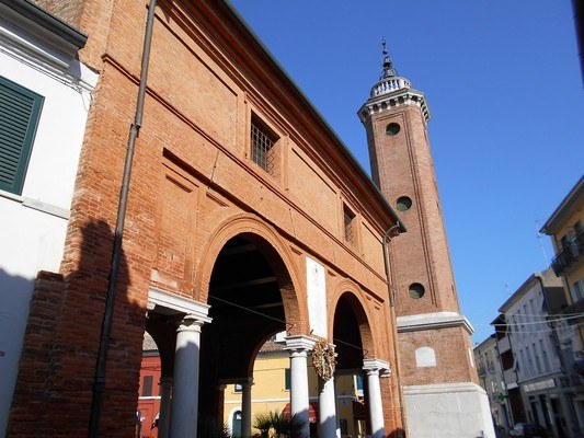 Al centro della città, in via Ugo Bassi, si possono vedere la Torre Civica (o Torre dell'orologio) e la Loggia del Grano, incastonate ai fianchi di quello che prima della sua demolizione, avvenuta nel secolo XIX, era lo splendido Ponte di Piazza.